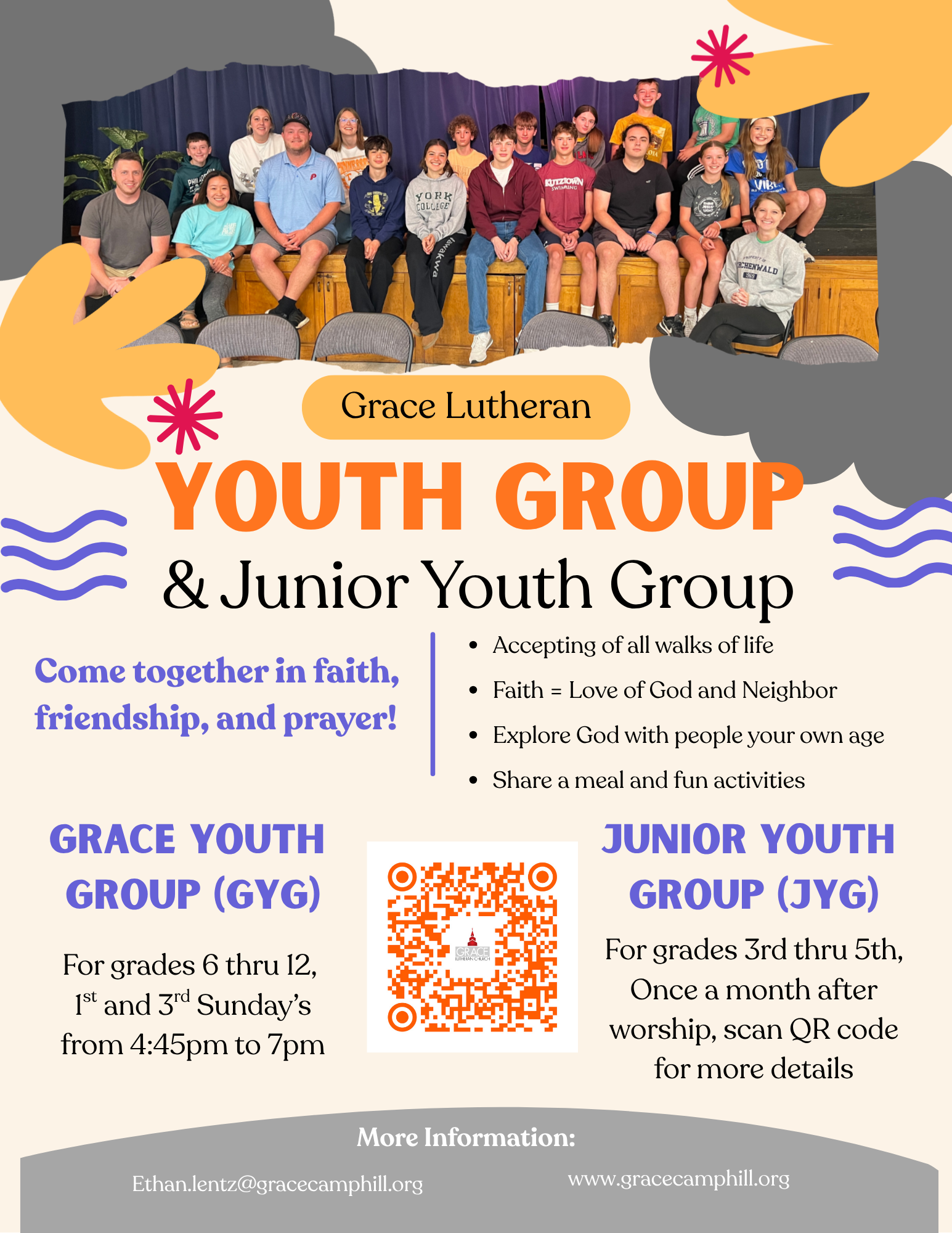 Junior Youth Group (JYG) meets every other month from October - May. This meeting time will allow its participants to learn all about the fun of youth group and what they can anticipate as they get ready for their Youth Group years. In these meetings there will be games, laughter, community building, and a splash of faith formation for our younger Grace participants. This meeting will also be great for our younger Grace participants to get to know those that are already in youth group, hear their stories, and get to build relationships with their older peers. Please contact Ethan Lentz with any quesitons at ethan.lentz@gracecamphill.org.